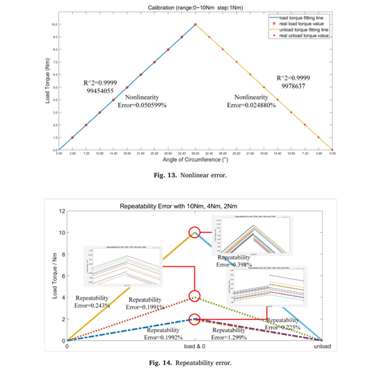 在性能评估方面,论文围绕非线性误差和重复性误差进行了系统测试,共完成 60 组实验。结果表明,该传感器最大非线性误差为 0.05%,出现在 10 Nm 加载工况下;最大重复性误差为 1.30%,出现在 2 Nm 卸载工况下。作者进一步指出,这些误差主要来源于 PEEK 弹性轴自身的机械迟滞与蠕变,以及伺服电机最小输出步进带来的加载误差,而不是来自光学读出系统本身。