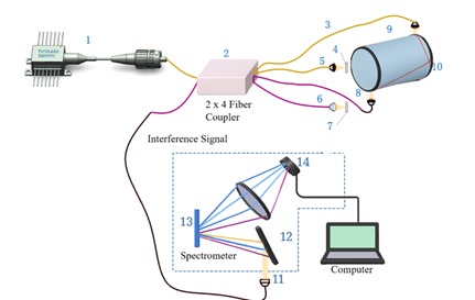 在系统结构上,论文采用 2×4 光纤耦合器实现双光路、单光源同步测量,避免了双光源方案带来的时序不同步和系统成本上升问题。为防止两路信号在同一光谱采集链路中产生串扰,研究引入频分复用(FDM)思想,并将两路光程差设置为约 10 mm,以建立足够的“隔离带”,确保两组频率成分在频域上稳定分离。