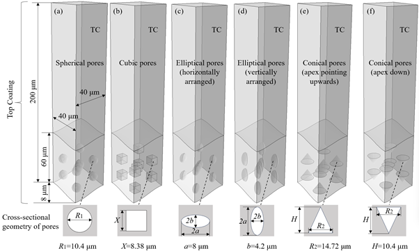 研究对比分析了六种不同三维孔隙形态对应力分布的影响。在相同孔隙率下,孔隙的存在会显著放大陶瓷层内的局部应力,且其放大效应与孔隙形貌和取向强相关。其中,尖端向上的圆锥形孔隙和水平取向的椭球形孔隙引发的应力集中最为严重。这意味着,在涂层制备过程中,控制孔隙形态与取向,与调控孔隙率同等重要。