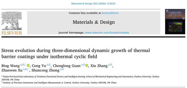 近日,福建省太赫兹功能器件与智能传感重点实验室主任,钟舜聪教授团队,在材料科学权威期刊《Materials & Design》(JCR Q1,IF:7.9)发表了题为“Stress evolution during three-dimensional dynamic growth of thermal barrier coatings under isothermal cyclic field”的研究论文。论文建立了考虑TGO动态生长、材料蠕变、多种三维孔隙形貌及孔隙-界面粗糙度耦合作用的三维有限元分析模型,研究了陶瓷层孔隙与界面粗糙度的耦合作用机制,系统揭示了等温热循环作用下TBC内部的应力演化机理。结果表明,TGO生长持续提升界面应力,而蠕变则提供关键松弛效应;孔隙显著放大应力幅值,其形貌和取向对局部应力集中起决定性作用;界面粗糙度与孔隙之间存在强非线性耦合,在特定粗糙度比值下协同效应达到峰值。研究成果为提升热障涂层的耐久性和寿命设计提供了基础理论依据和工程指导。论文第一作者为实验室副主任王冰教授,第二作者为余聪硕士研究生,实验室关成龙讲师、张鑫讲师、许占文副研究员和钟舜聪教授等对论文的基础理论做出重要贡献。