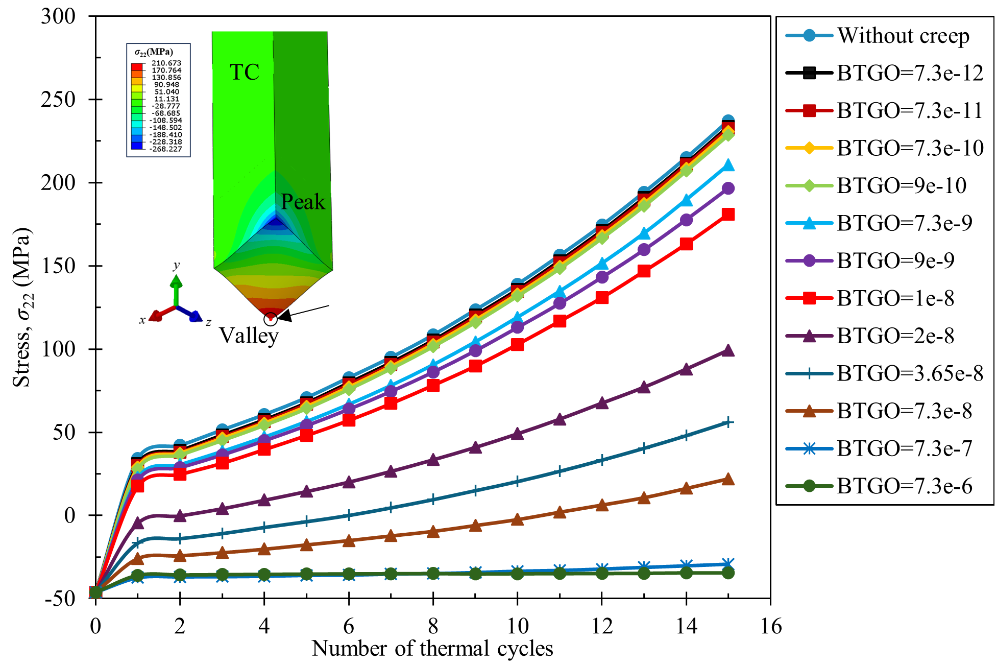 研究量化了TGO蠕变速率对界面应力的作用机制。结果表明,TGO的持续增厚是界面应力升高的主要驱动力,而高温蠕变则提供了关键的应力松弛机制。二者存在一个最优的“博弈”平衡点:当蠕变速率过低时,应力无法有效释放;当蠕变速率过高时,虽能松弛应力,但会意外加速热生长氧化物的异常增厚,反而可能导致结构失稳和过早失效。这为通过材料设计调控TGO蠕变性能指明了方向。
