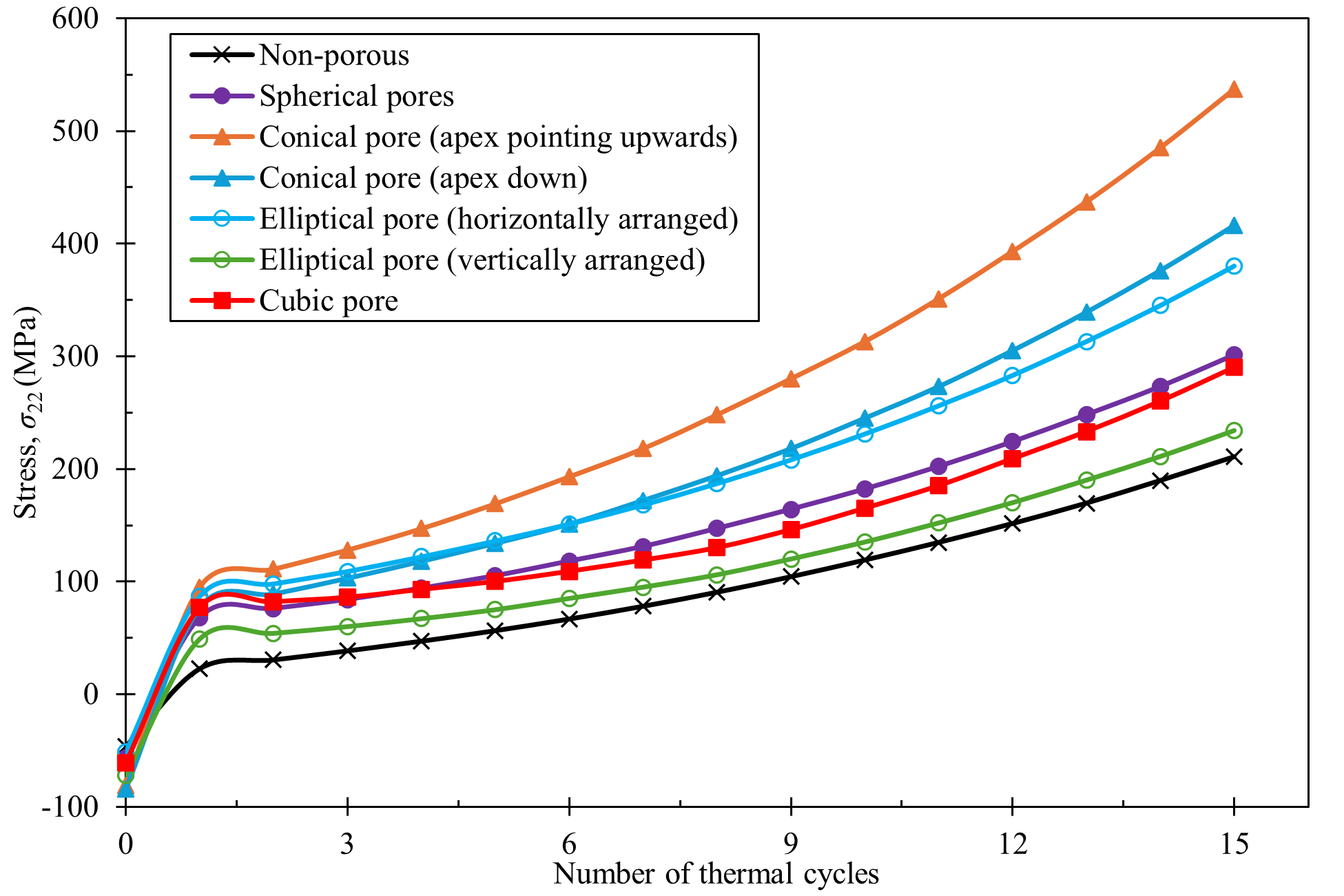 图3 不同孔隙形态对陶瓷层应力演化的影响机制