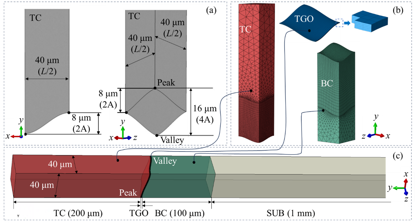 研究基于ABAQUS有限元分析平台,通过UEXPAN子程序创新性地实现了热生长氧化物的三维动态生长模拟,并引入Norton蠕变律描述各层材料的高温蠕变效应,突破了以往研究中将热生长氧化物简化为静态层的局限。为了贴近真实的大气等离子喷涂工艺制备的热障涂层微观结构,模型不仅构建了具有三维余弦波形态的涂层/粘结层界面,还通过布尔运算在陶瓷层内部引入了球形、圆锥形、椭球形(不同取向)和立方体等多种形态的孔隙,系统研究了它们对应力场的作用机制。同时,通过改变界面波幅(A)与波长(L)的比值,并在不同界面粗糙度下引入孔隙率相同的孔隙,探究了界面粗糙度与孔隙的耦合作用机制。