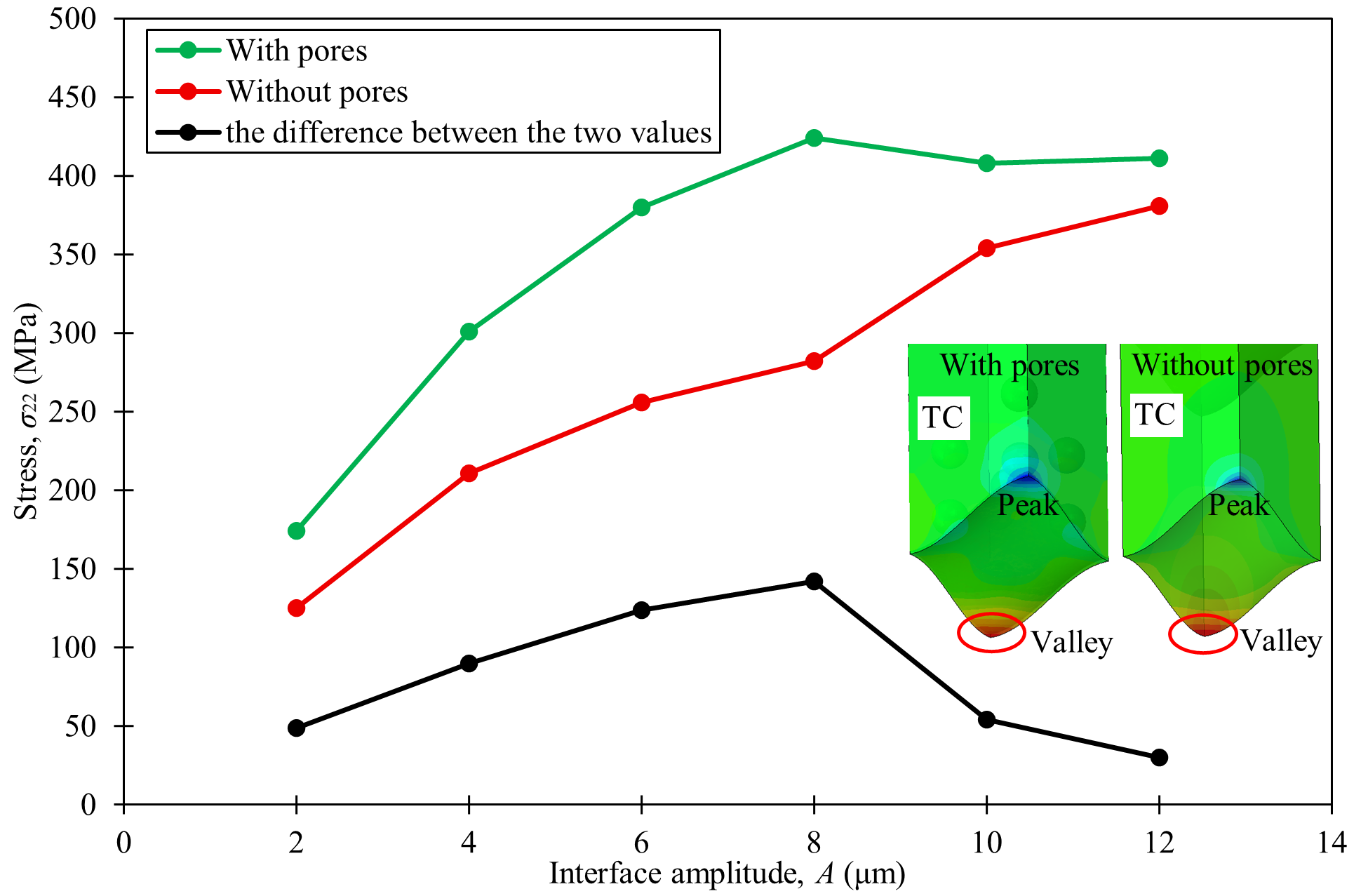 图4 界面粗糙度与孔隙的耦合效应:在特定粗糙度(A=8 μm)下,孔隙引起的应力增量达到最大,揭示了二者的非线性协同机制