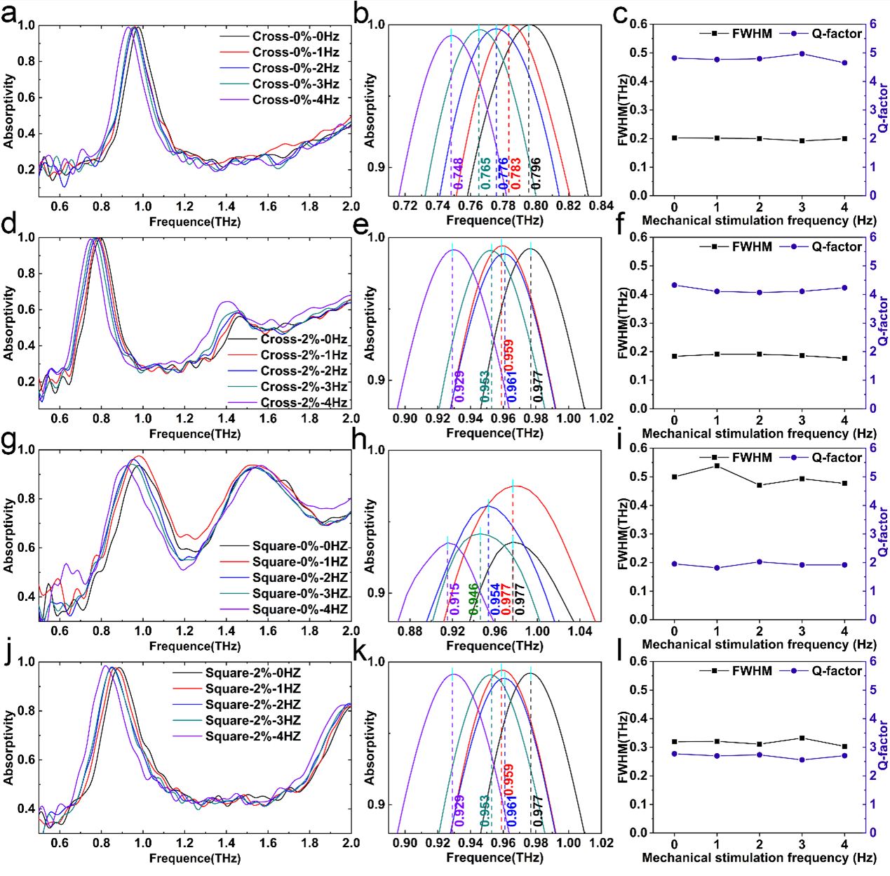 Figure 4. Terahertz absorption performance of PM-TMA with different resonator geometries and doping concentrations under mechanical stimulation frequencies from 0 to 4 Hz. a) Absorption spectra of the Cross-0%. b) Magnified view of the dominant absorption peak from (a). c) FWHM and Q-factor of the absorption peak for the Cross-0% as a function of mechanical stimulation frequency. d) Absorption spectra of the Cross-2%. e) Magnified view of the dominant absorption peak from (d). f) FWHM and Q-factor of the absorption peak for the Cross-2% device as a function of mechanical stimulation frequency. g) Absorption spectra of the Square-0%. h) Magnified view of the dominant absorption peak from (g). i) FWHM and Q-factor of the absorption peak for the Square-0%. j) Absorption spectra of the Square-0%. k) Magnified view of the dominant absorption peak from (j). l) FWHM and Q-factor of the absorption peak for the Square-0%.