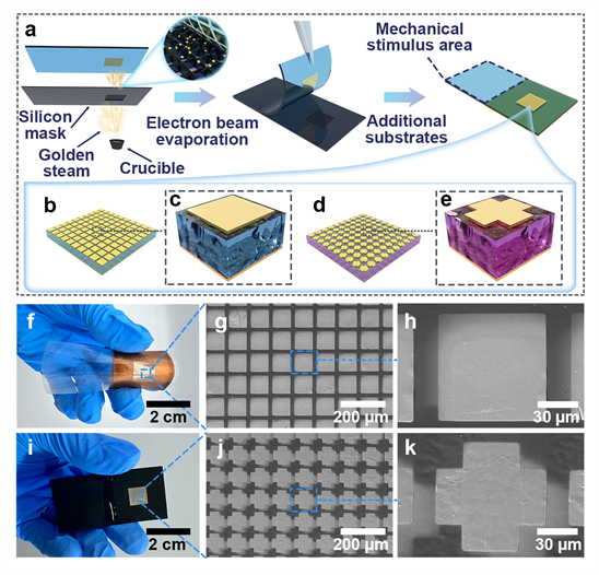 Figure 3. Fabrication and morphological characterization of the PM-TMA. (a) Schematic diagram of the fabrication process for the PM-TMA. (b,c) Schematic of the array and unit cell of PM-TMA with a pure PVDF film dielectric layer. (d,e) Schematic of array and unit cell of PM-TMA with PVDF-MoS2 composite film (2 wt%) as dielectric layer. (f) Optical photograph of the fabricated PM-TMA with a pure PVDF film as the dielectric layer. (g,h) SEM images of the gold micro-square resonators. (i) Optical photograph of the fabricated PM-TMA with a PVDF-MoS2 composite film (2 wt%) as the dielectric layer. (j,k) SEM images of the gold micro-cross resonators.