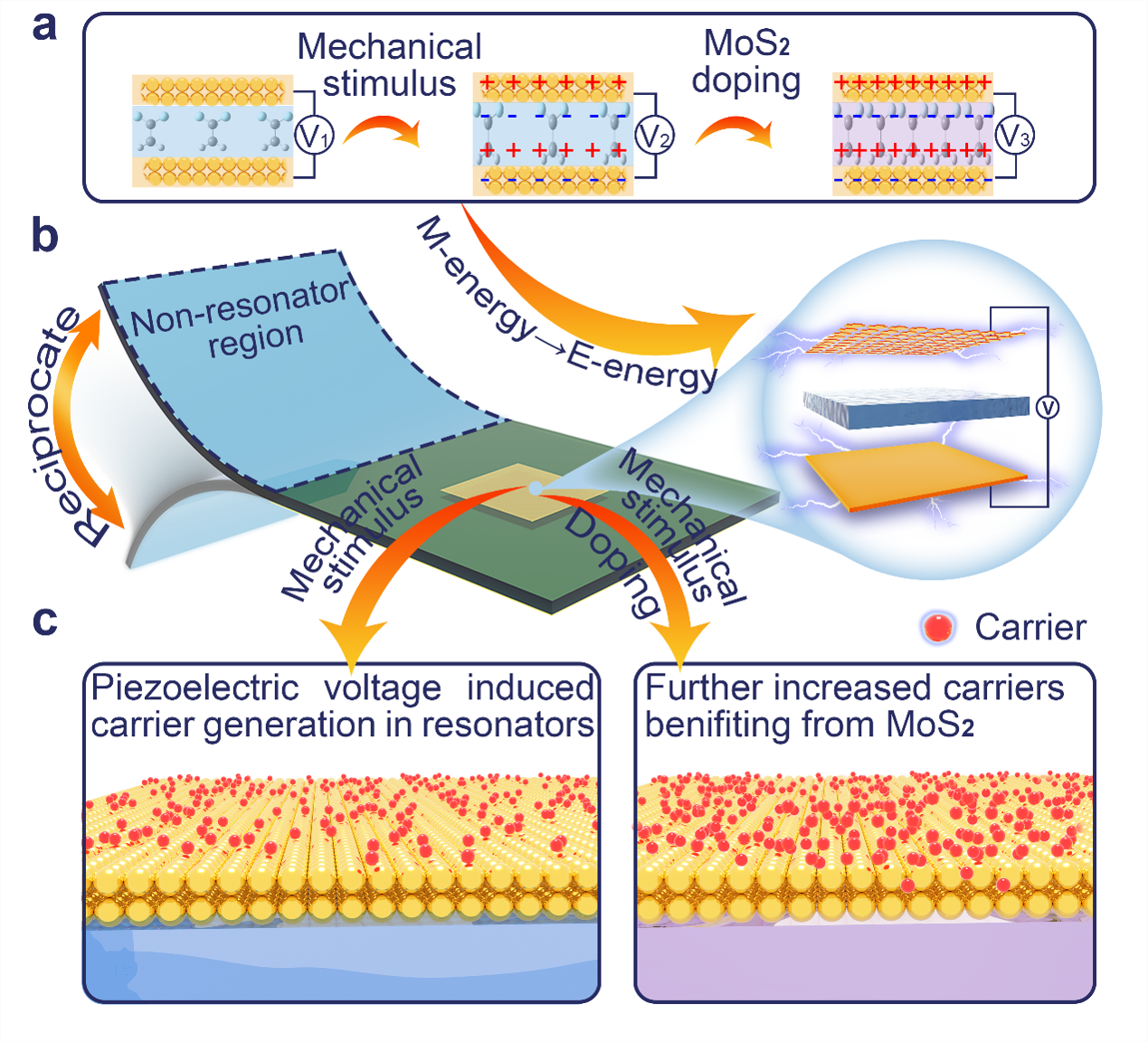 Figure 1. Mechanically tunable terahertz metamaterial absorber (PM-TMA) based on piezoelectric effect of PVDF-MoS2 composite films. (a) Schematic diagram of the modulation of piezoelectric effect and charge transfer mechanism under mechanical stimulation and MoS2 doping. (b) Schematic diagram of the operation mechanism of PM-TMA. (c) Carrier concentration variation principle for the top gold resonator of PM-TMA.