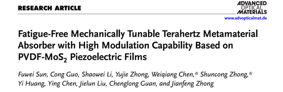 近日,福建省太赫兹功能器件与智能传感重点实验室在国际知名光学期刊《Advanced Optical Materials》(中科院2区,IF:7.2)发表了题为“Fatigue-Free Mechanically Tunable Terahertz Metamaterial Absorber with High Modulation Capability Based on PVDF-MoS2 Piezoelectric Films”的论文。本文创新性地提出了利用压电调谐策略构建吸波器来解决上述问题。通过模拟及实验验证发现,在非接触式的机械刺激下,实现了对高Q值完美吸收峰的精准多级调控。这项研究展示了压电调控策略在搭载不同谐振器和介电层时太赫兹超材料吸波器的电磁响应特征,为可调谐太赫兹超材料吸波器的设计提供了一种新的方法。得益于基于压电的调谐策略,该太赫兹超材料吸波器能实现非接触式的机械调谐,有效地避免了疲劳损伤并提高了器件的耐久性。重点实验室孙福伟副教授与2023级硕士研究生郭聪同学为论文的共同第一作者,重点实验室主任钟舜聪教授为论文的通讯作者。