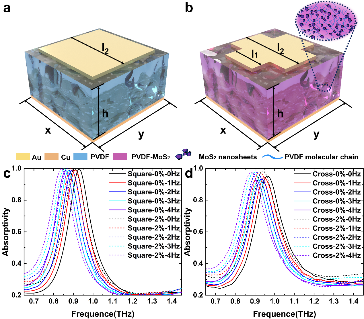 Figure 2. Unit cell structure and simulated terahertz absorption spectrum of PM-TMA. (a) Schematic of the unit cell structure of PM-TMA with micro-square resonator (dielectric layer without MoS2 doping). (b) Schematic of the cell structure of PM-TMA with micro-cross resonator dielectric layer with (MoS2 doping concentration of 2 wt%). (c) Terahertz absorption spectra of PM-TMA (micro-square resonator) with undoped and 2 wt% MoS2-doped dielectric layers under different mechanical stimulation frequencies. (d) Terahertz absorption spectra of PM-TMA (micro-cross resonator) with undoped and 2 wt% MoS2-doped dielectric layers under different mechanical stimulation frequencies.